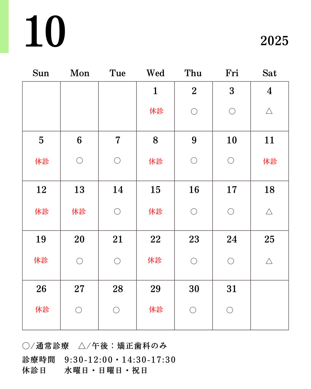 10月の休診について 2025.09.18 10月の休診日についてご連絡いたします。 ■休診日 水曜日、日曜日、祝日以外に 10月11日(土)は休診いたします。 ■診療日について 上記以外は診療いたします。 ご理解ご協力のほど、よろしくお願い申し上げます。